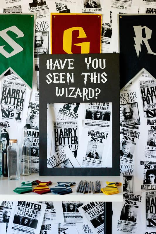 - Backdrops – I created a “Wanted Poster Wall“ by printing black-and-white Harry Potter posters (plus a few silly photos of my son for a personal touch!).
