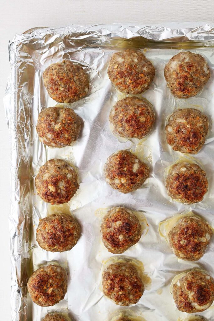 - Scoop ¼ cup of mixture per meatball and roll lightly into balls. Place evenly spaced on a foil-lined baking sheet.