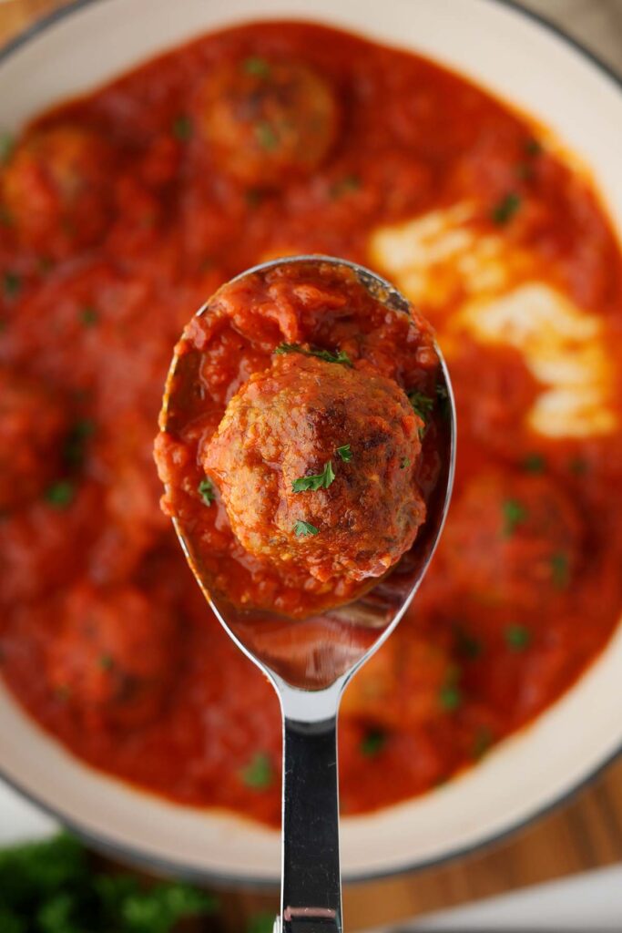 Use a cookie scoop to portion the meatballs evenly. They’ll cook at the same rate, which helps prevent some from drying out while others finish cooking.