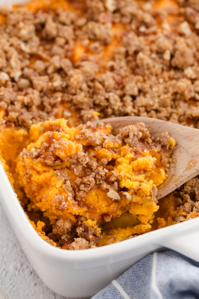 - Marshmallow topping: If you love the classic version, skip the pecan mix and top your casserole with mini marshmallows instead. Bake uncovered for 25 minutes, then broil for 1–2 minutes until golden and toasty.
